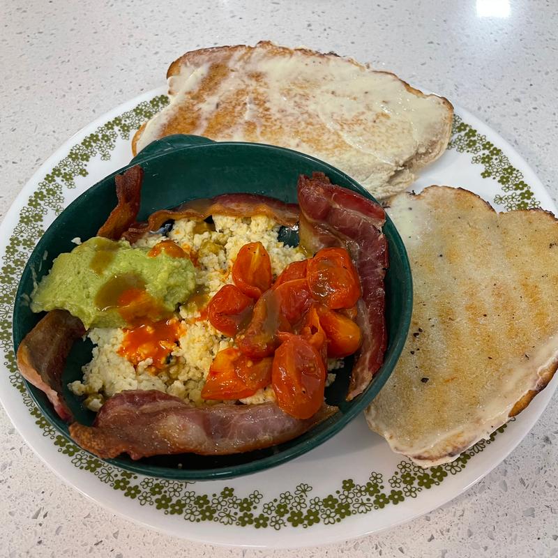 2 scrambled eggs, roasted cherry tomato, fresh avocado slices, bacon.