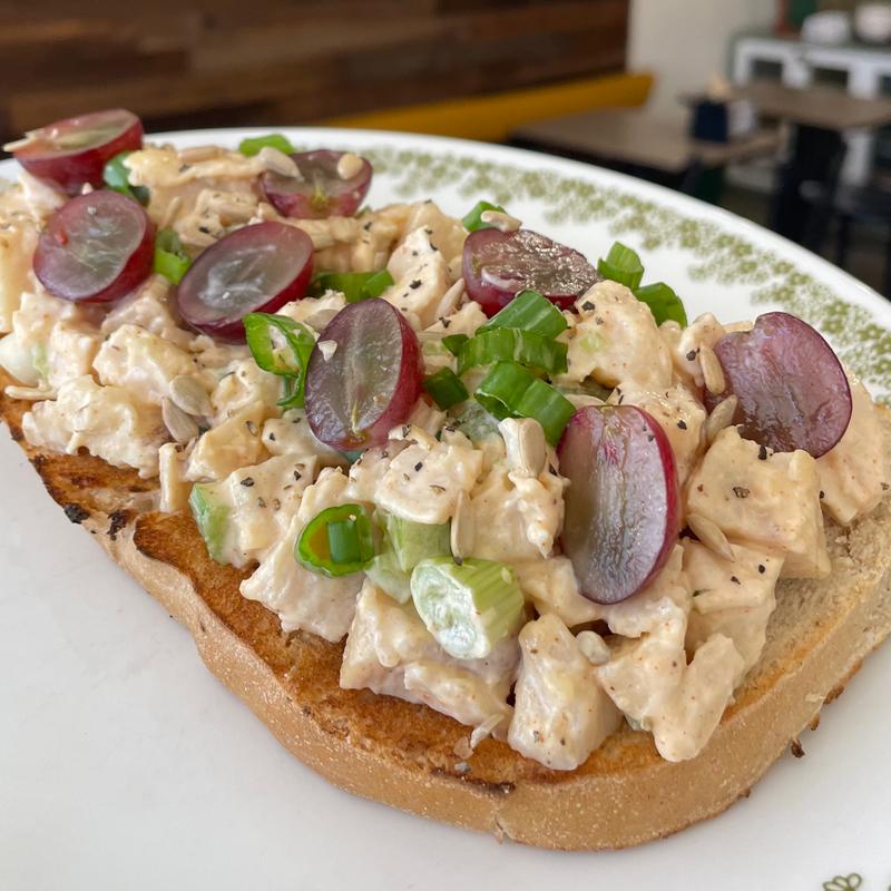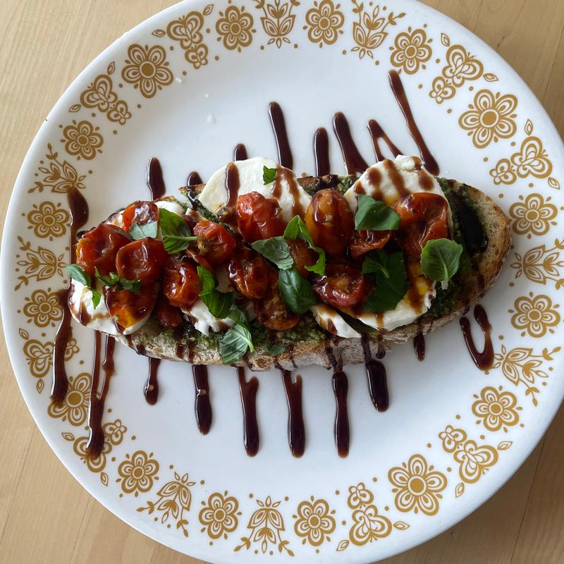 Smashed Avocado, Humboldt Goat Cheese Crumble, Roasted Heirloom Cherry Tomatoes, Sea Salt, Olive Oil.